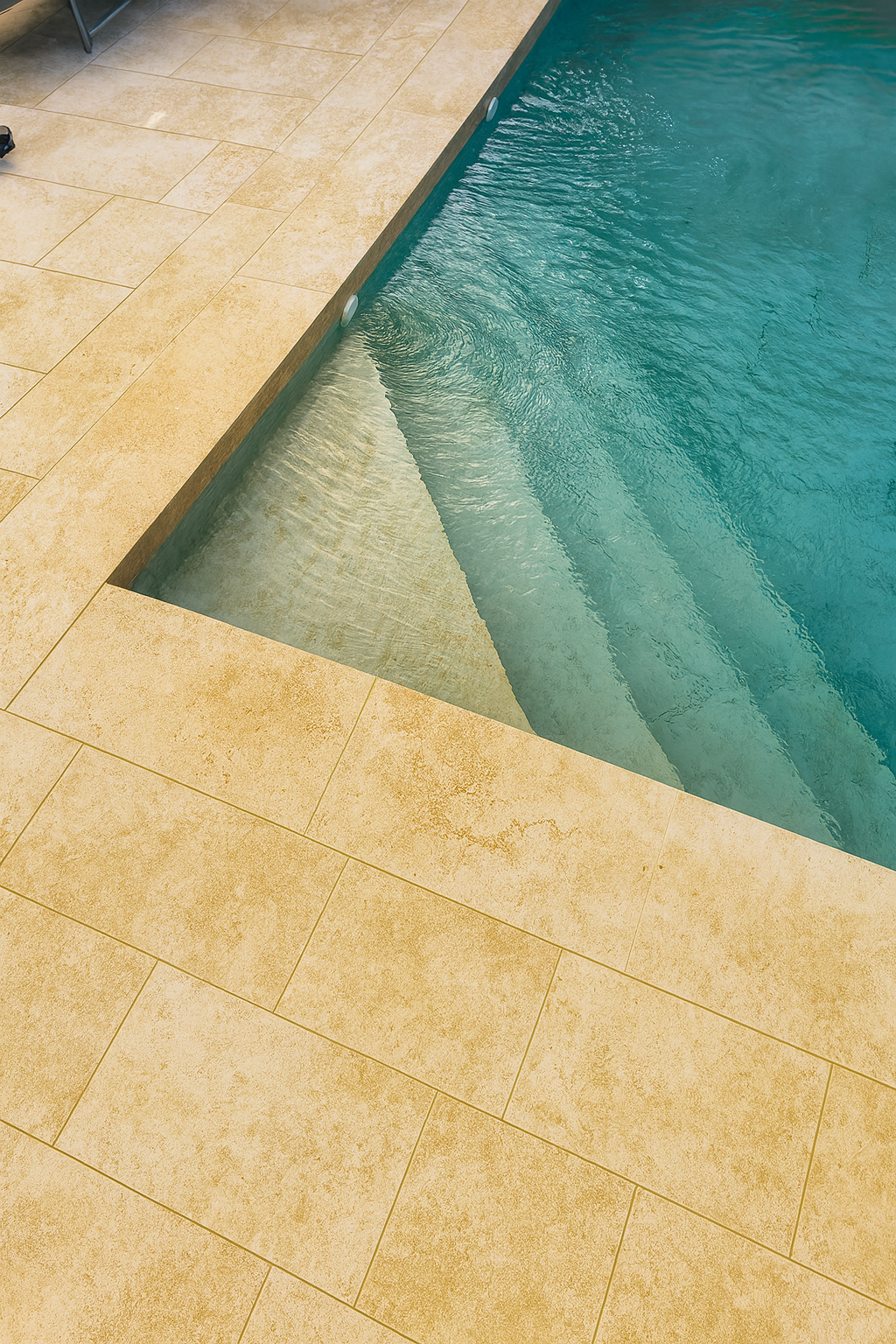 El porcelánico refleja la luz de manera suave, dando al agua un tono luminoso y relajante.