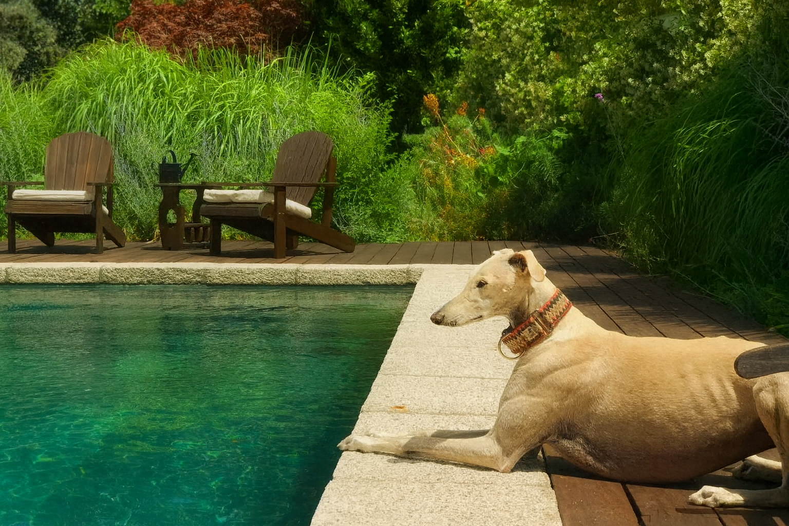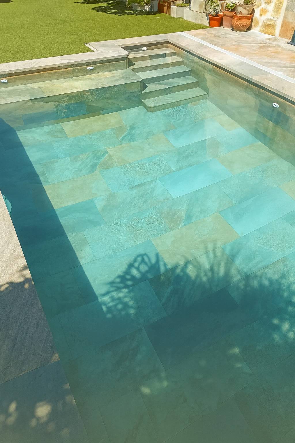 Paraíso entre verdes - Piscina revestida en pizarra verde bosque, cuyo tono profundo aporta una elegancia serena y un aire orgánico al entorno.
