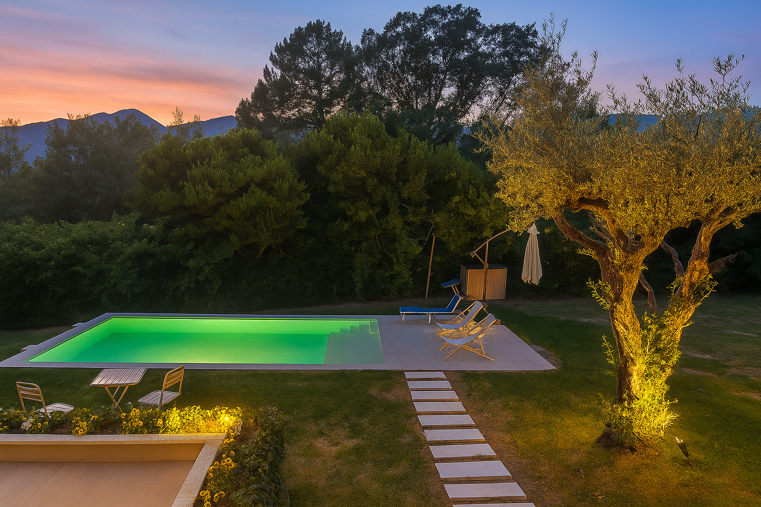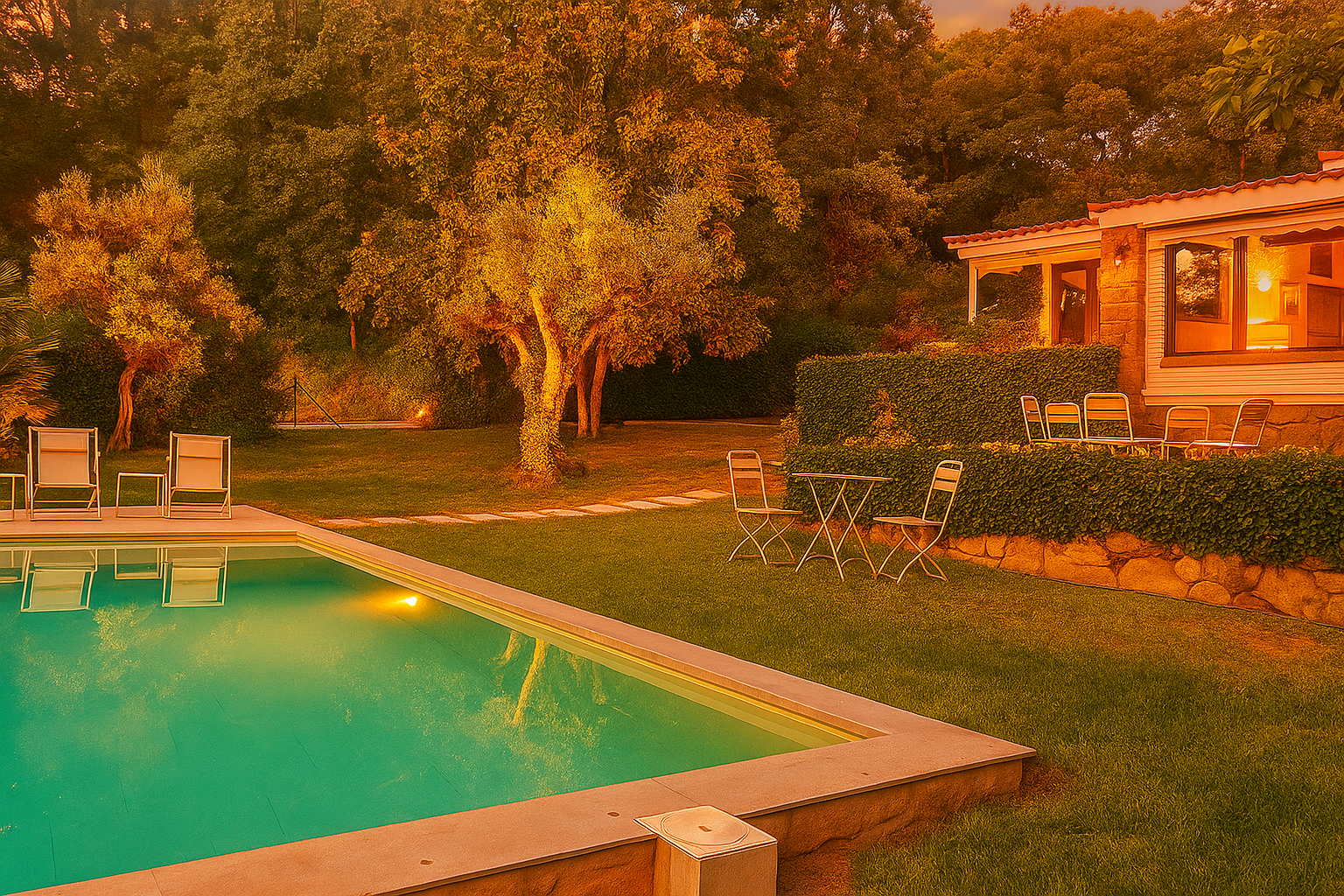 La iluminación subacuática transforma la piscina en un escenario envolvente que crea destellos suaves que realzan la calma del entorno natural.