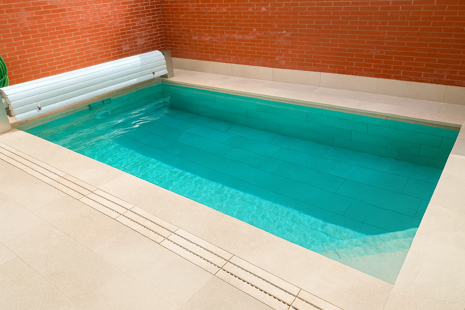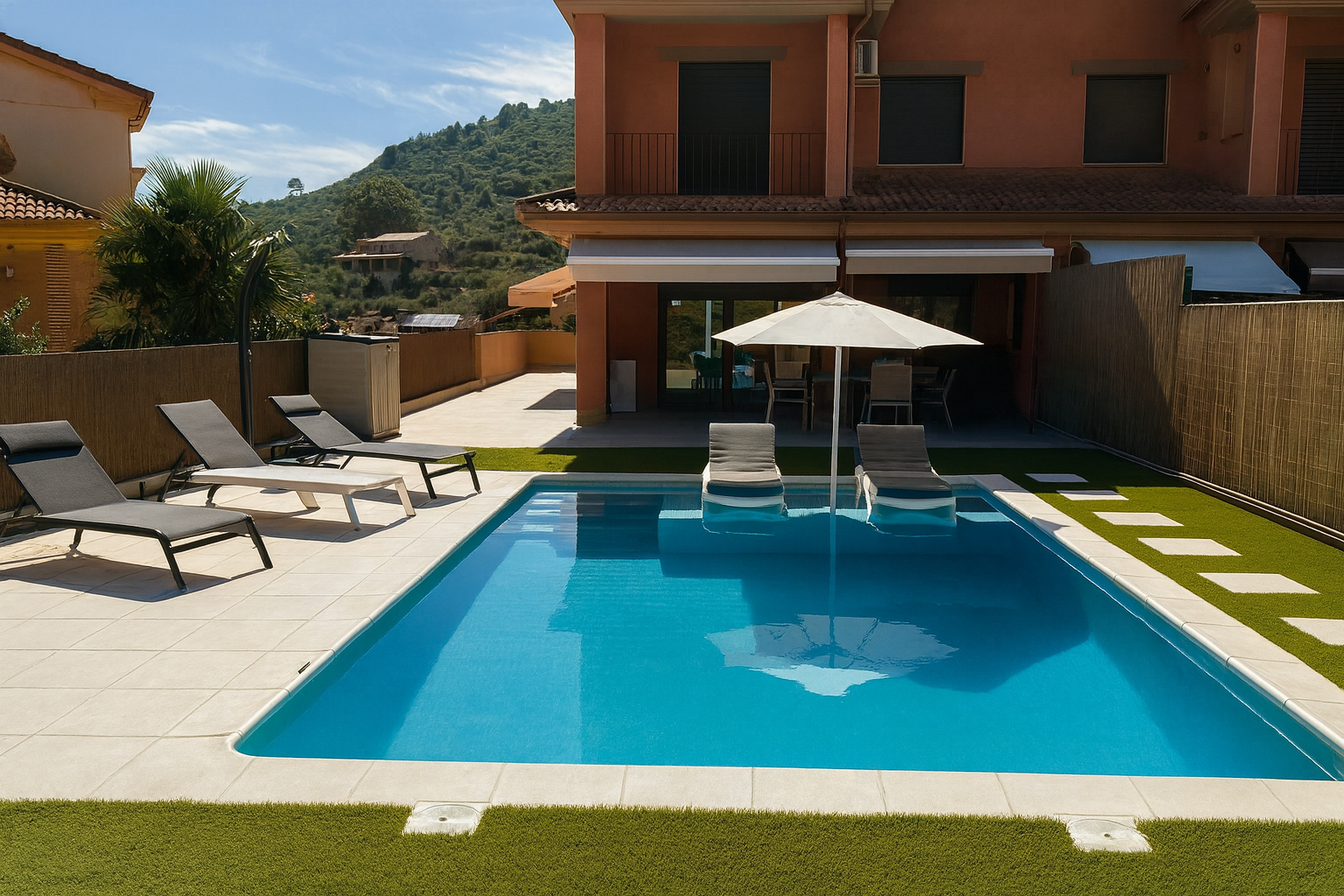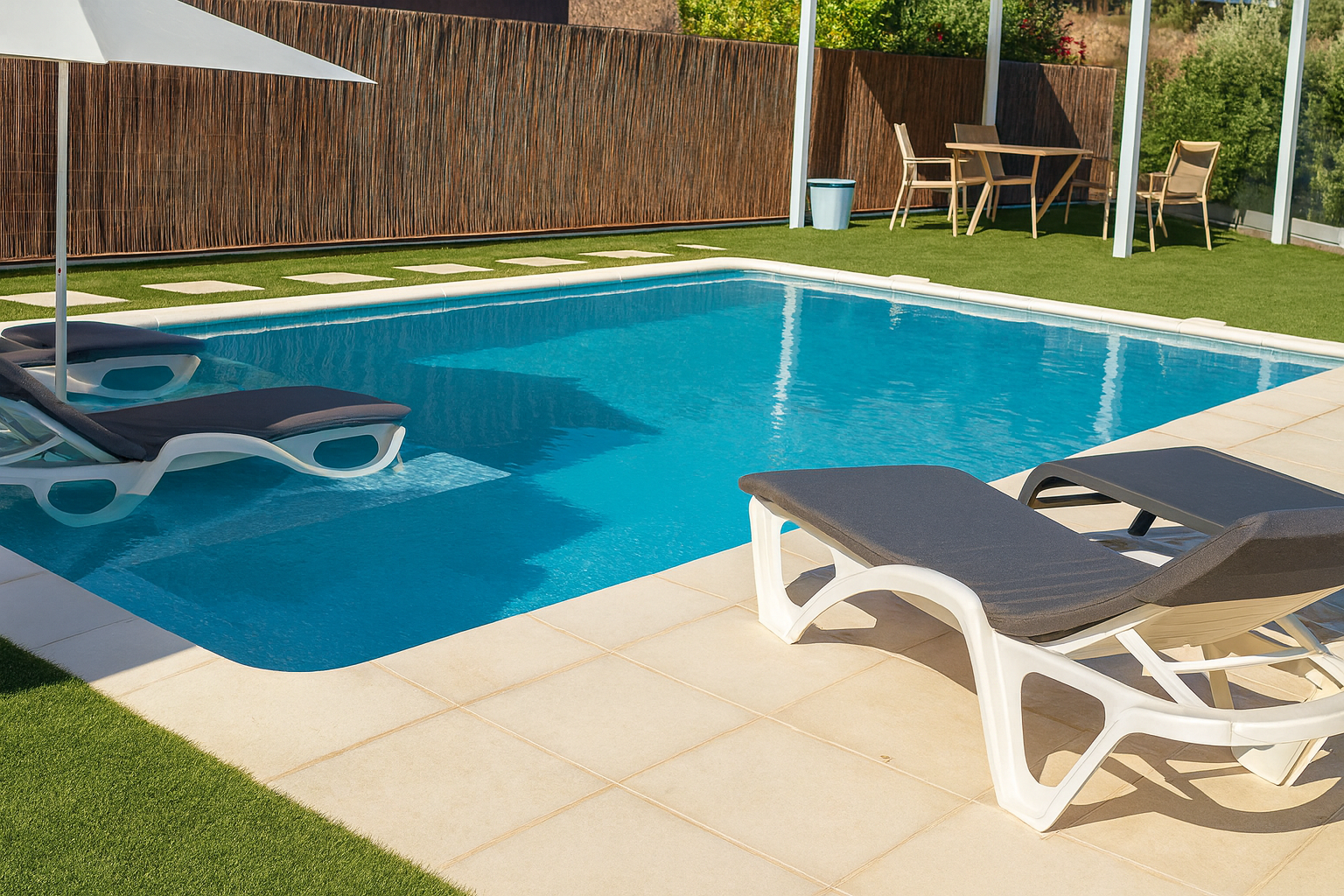 Azul Sereno con Playa Integrada - Revestida en gresite azul claro, esta piscina ofrece una sensación fresca y luminosa desde el primer vistazo.