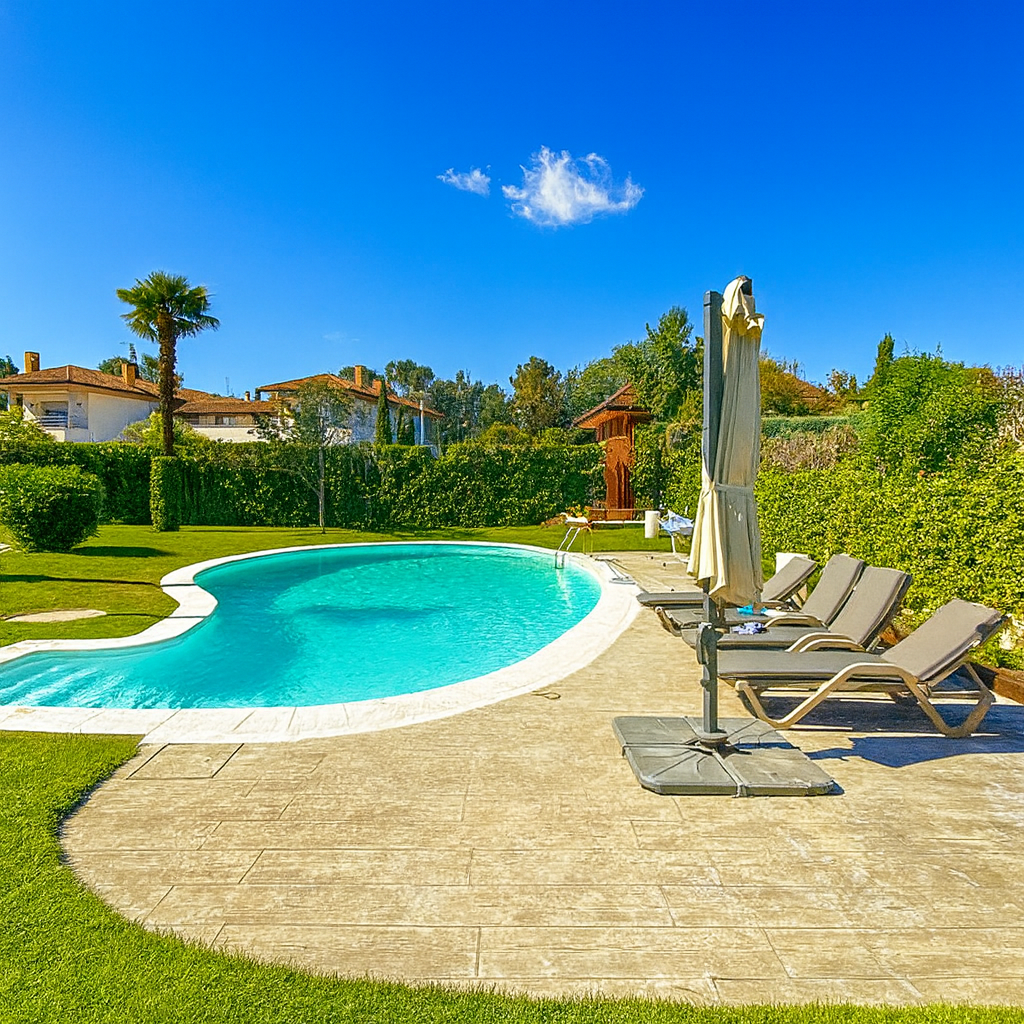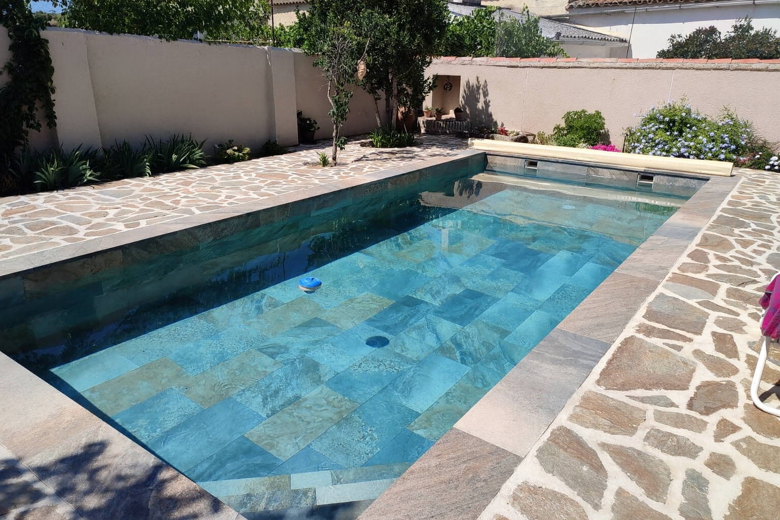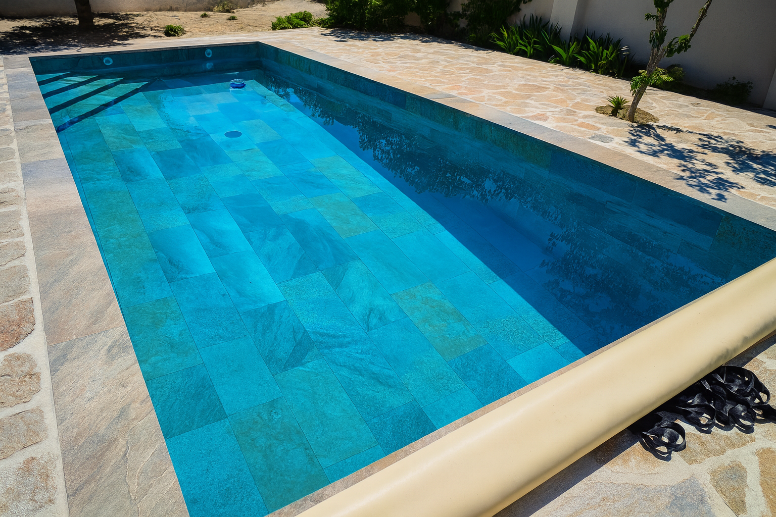 Azul Sereno con Playa Integrada - Revestida en gresite azul claro, esta piscina ofrece una sensación fresca y luminosa desde el primer vistazo.