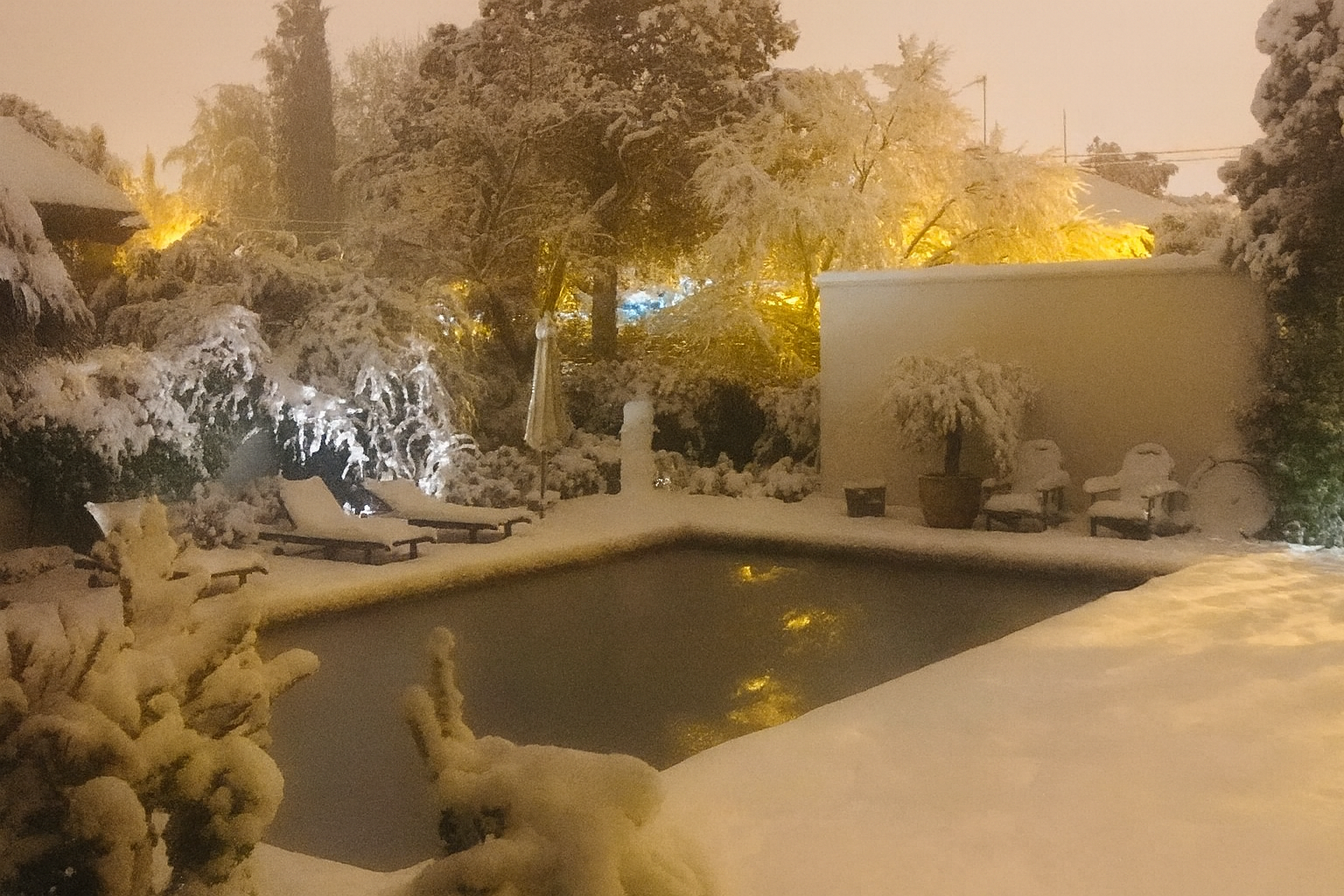 Un manto de nieve cubre el entorno y transforma la escena: la piedra, la madera y la pizarra contrastan con el blanco, ofreciendo una imagen tranquila y casi mágica.