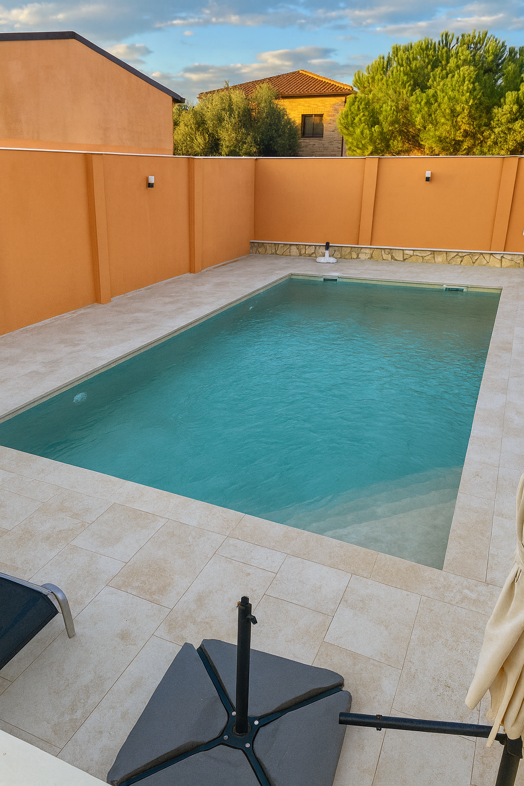Armonía Beige en un Entorno Natural - piscina rectangular revestida en porcelánico beige claro se integra con suavidad en el paisaje que la rodea.