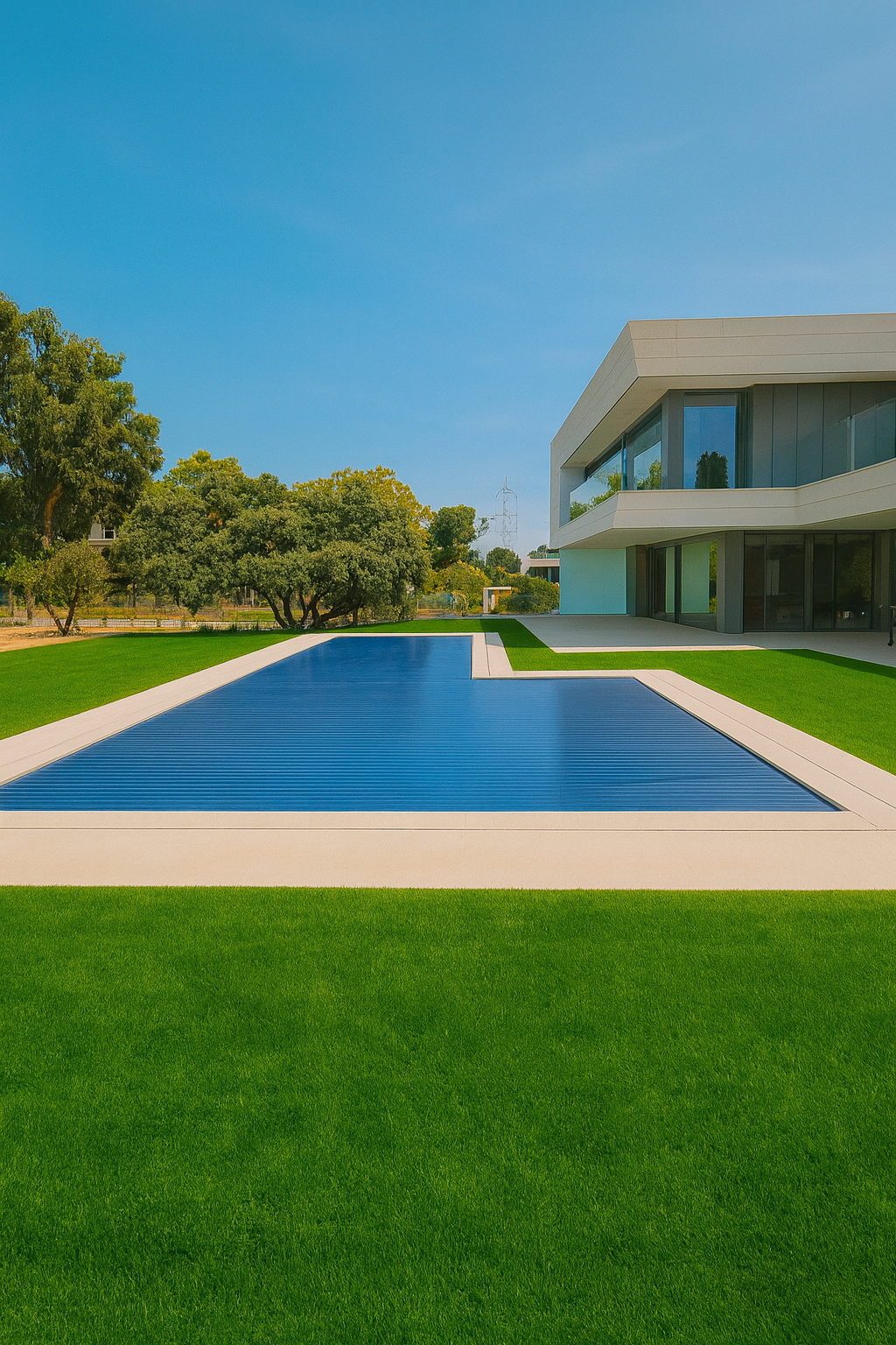 La cubierta motorizada de lámina PVC ofrece protección y seguridad con un solo toque, sin interferir en la estética de la piscina.