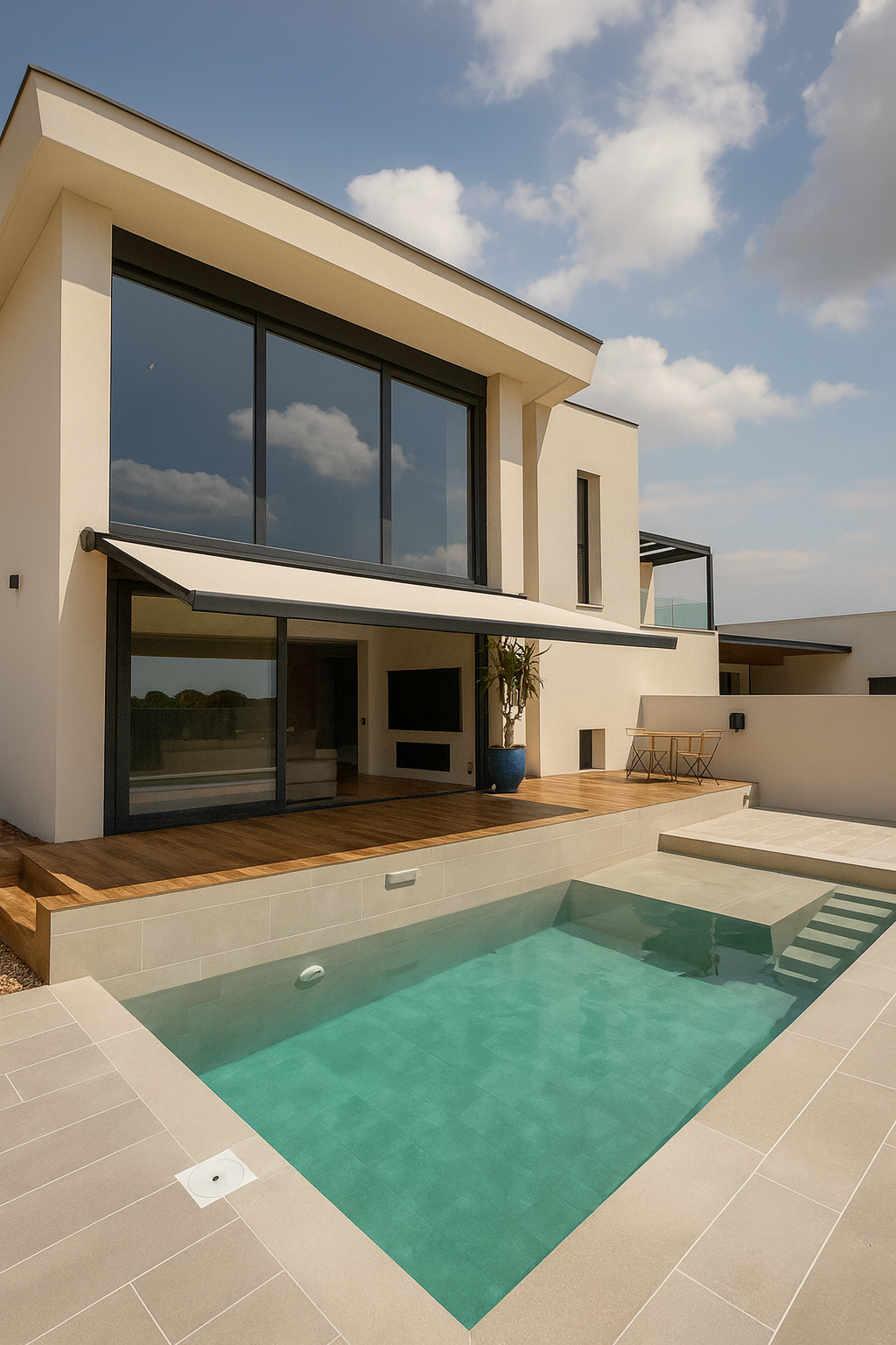 Líneas limpias y bien protegidas - Desde el color cálido del porcelánico hasta los detalles de acceso y protección, . esta piscina se convierte en el corazón del espacio.