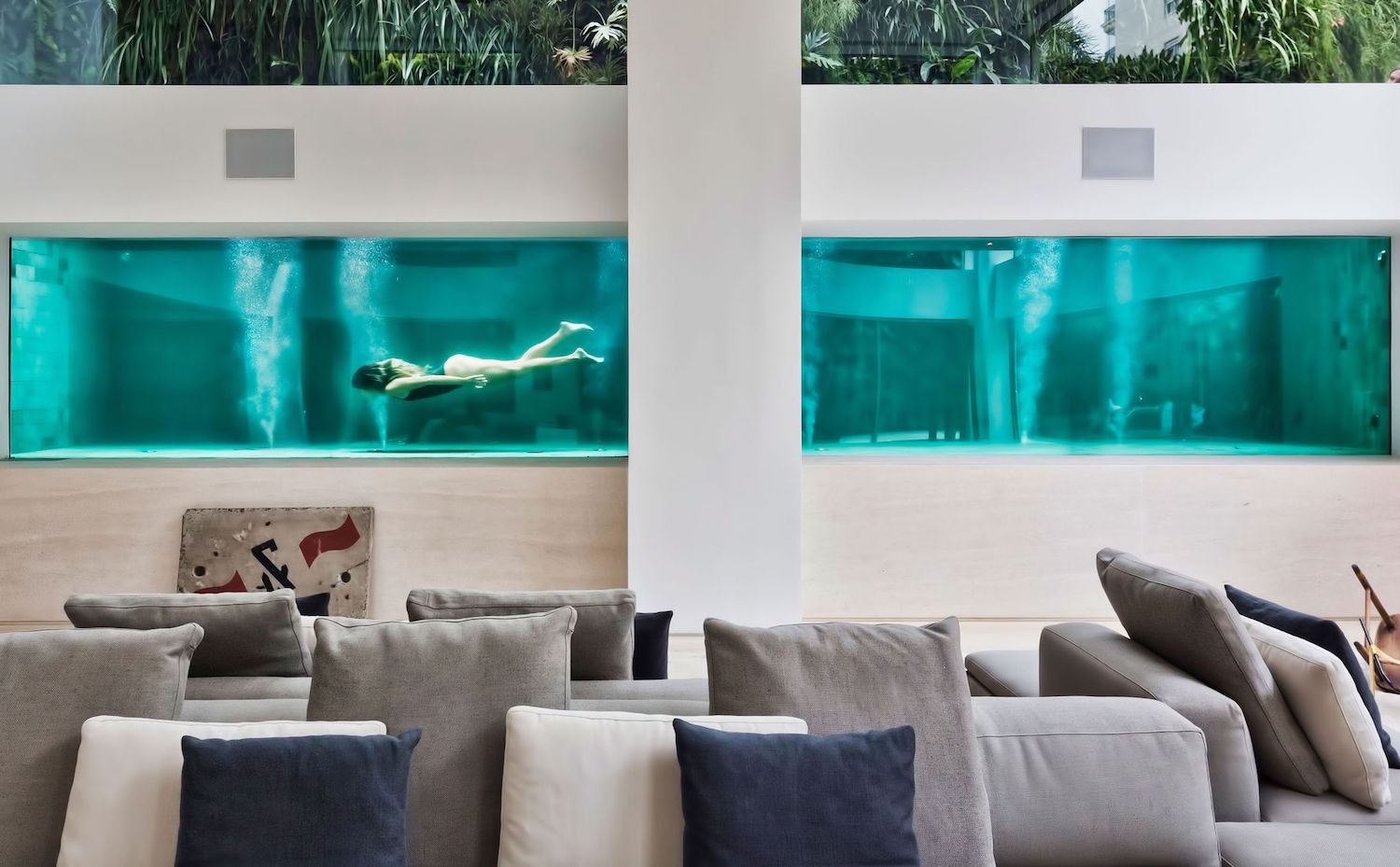 Por supuesto, las posibilidades son todas las que puedas imaginar. Hay quien decide poner una pared transparente, quien prefiere dos, están los que elevan la piscina del nivel del suelo para poner un fondo transparente, o quienes la integran con la casa haciendo de ella un acuario gigante. Éste último ejemplo se puede ver en la siguiente fotografía: