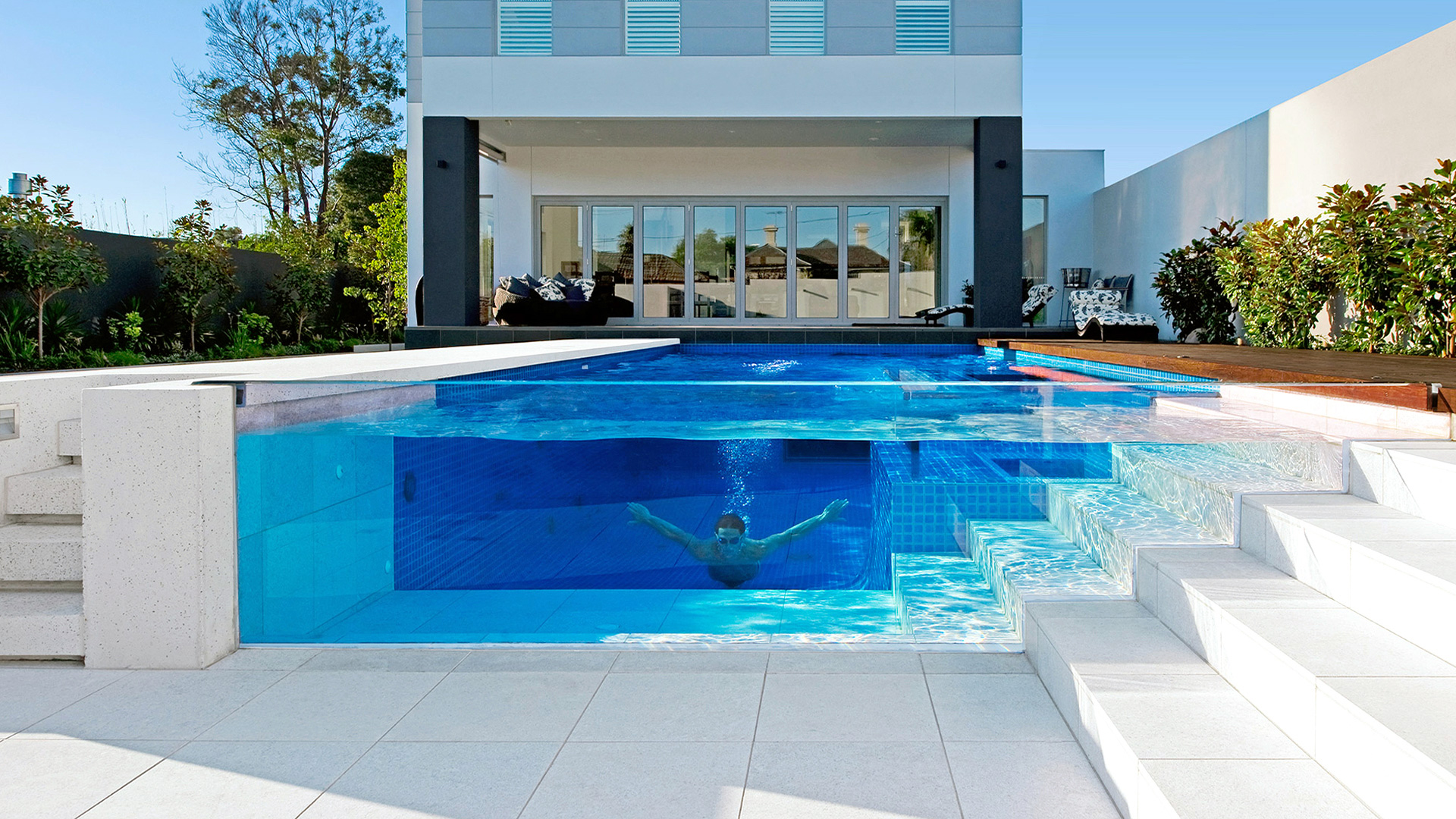 Si prefieres una piscina exterior al nivel del suelo, las posibilidades no son menos, y no hace falta ser millonario para tener la piscina de tus sueños ya que, a pesar de ser más caras que las piscinas convencionales, las piscinas transparentes ofrecen muchas opciones, todas ellas igualmente buenas, por ejemplo, solo un lateral de cristal, jugando con las alturas de los terrenos o con el diseño de las escaleras, como en la siguiente fotografía:
